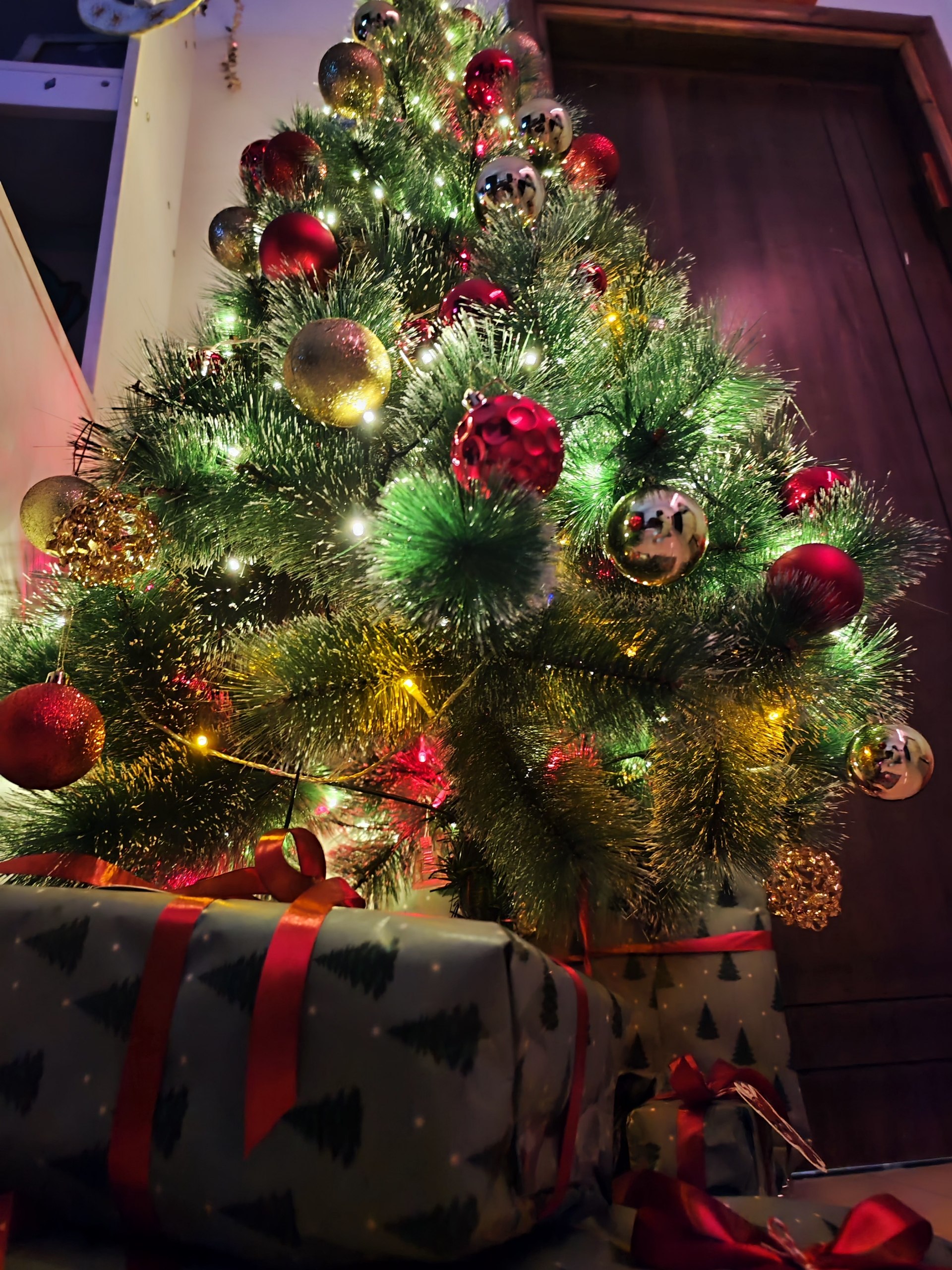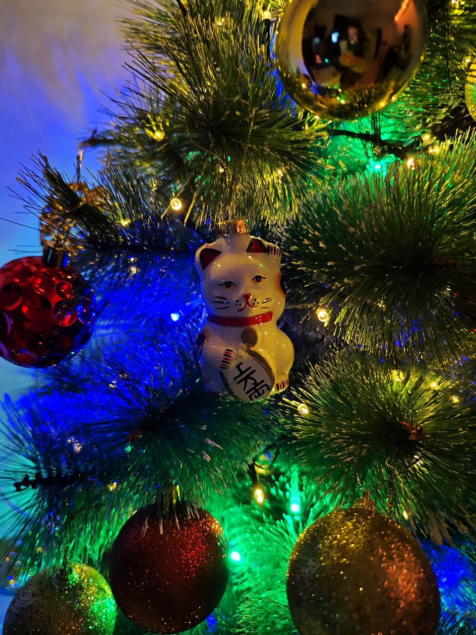 Наряжать было такое чудо классно, я купила золотых и красных шариков, муж герлянду повесил красивую, а под елку