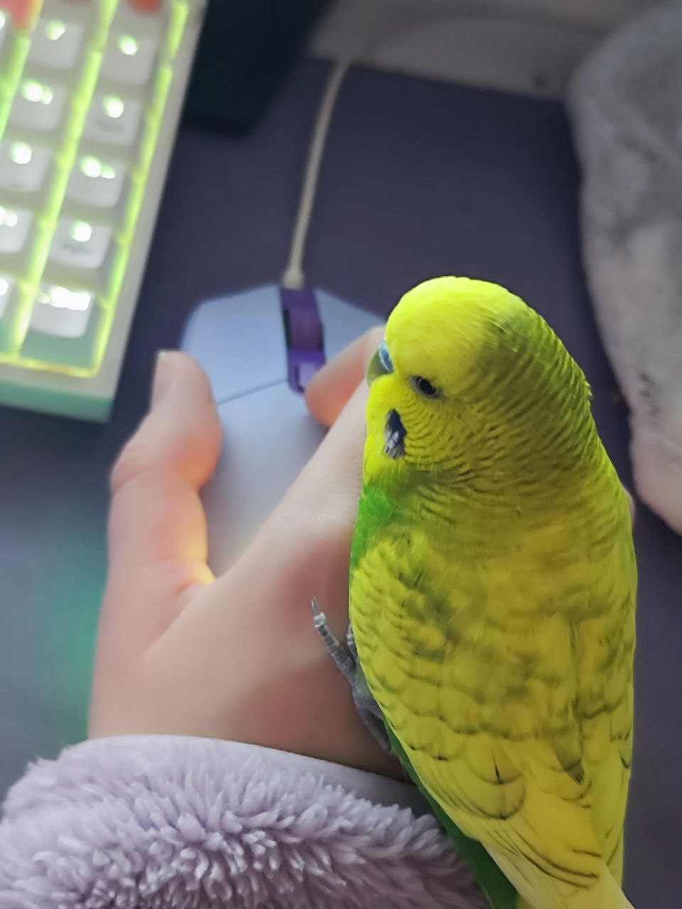 Радость моя. Сидит вот так иногда на мышке, Подробнее...или когда я в телефоне, то на телефон садится и чирикает)